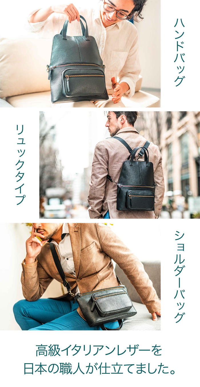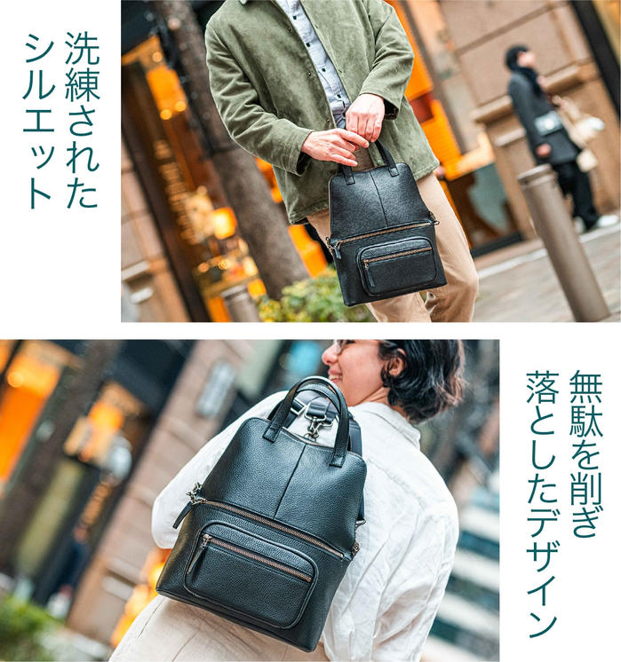 - この3WAYイタリアンレザーリュック は、 意匠登録された独自の変形機能 を搭載。革新的なデザインにより、状況に応じた最適なバッグ形態 を、簡単かつスムーズに切り替えることができます。類似品と比べても「このプロダクトでしか体験できない、計算された変形機構」が実現しました。