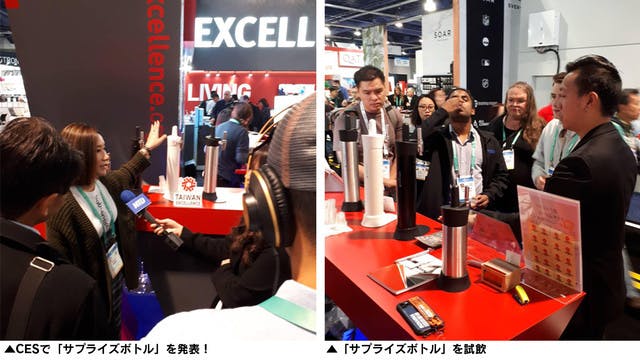 - アメリカ ラスベガスで開催される電気製品や最先端ガジェットを主に対象とする世界最大規模の展示会イベント CES(Consumer Electronic Show)で反響を呼びました。ブースには試飲コーナーがあり、次々と生まれる試飲者の驚きの声に皆が立ち止まって、このサプライズボトルによる味&食感の変化を体験しました。ブースを訪れた多くの人々のドリンクへのイメージを覆すことで、まさにドリンク革命を起こしました。