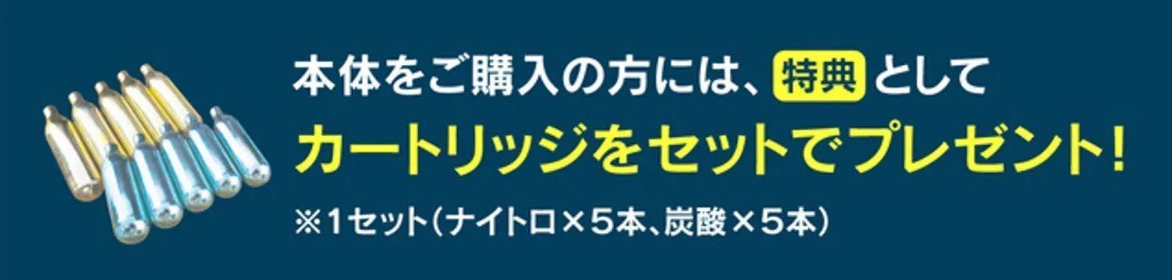 - ■ 今回だけのお得な特典! 本商品は別売りのガスカートリッジが必要となっておりますが、今回に限り商品到着後すぐに使用していただけるよう、特別にCO₂(炭酸)N₂(窒素) のカートリッジをセットにいたします。※カートリッジ本数はリターン毎に異なります。