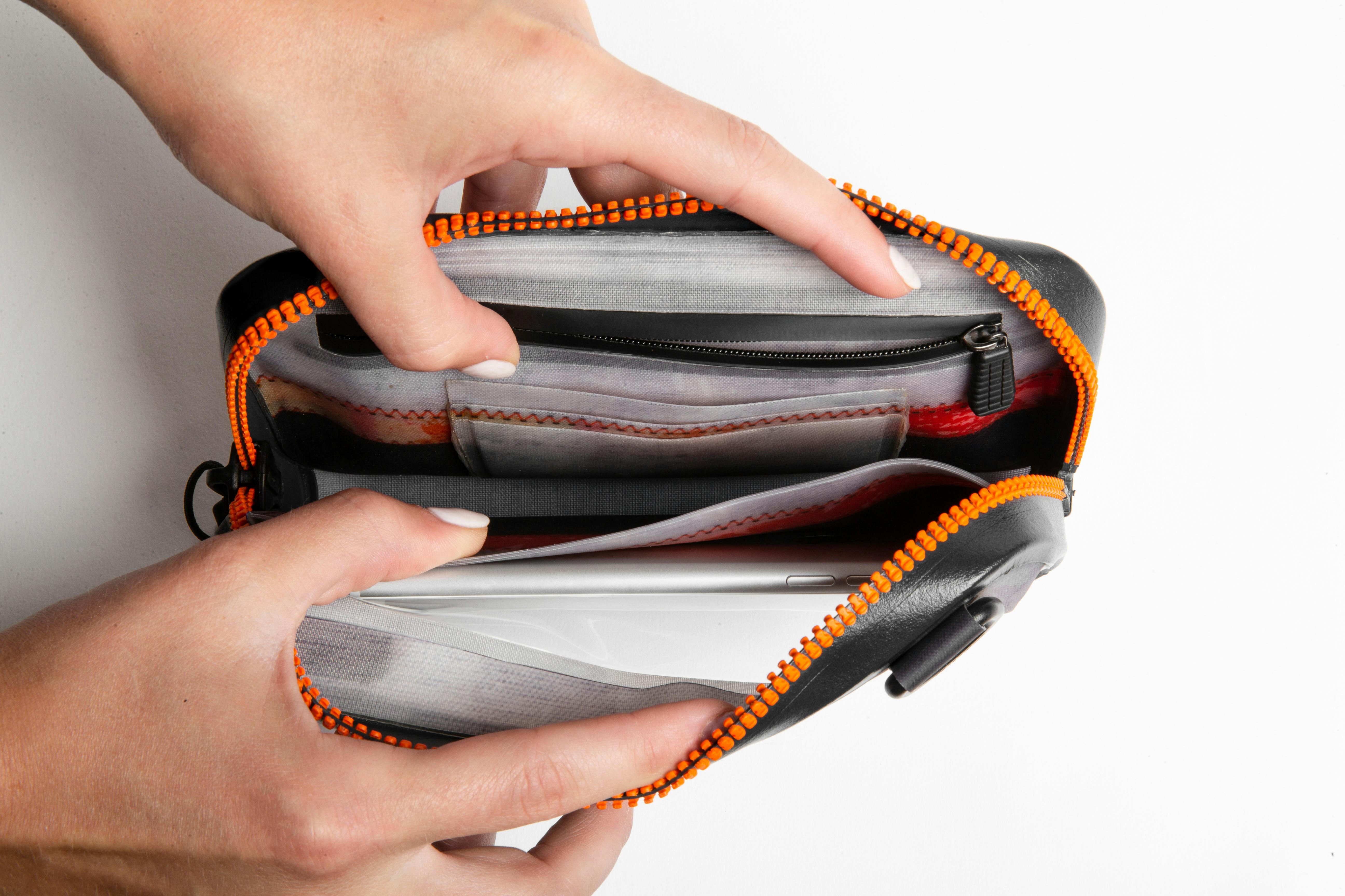 一般的な防水ポーチではファスナーや縫製部分から水が浸入する恐れがあります。 -