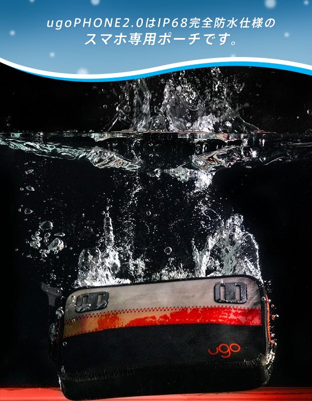 【ugo(ユーゴ) PHONE2.0】はIP68完全防水仕様のスマホ専用ポーチです。