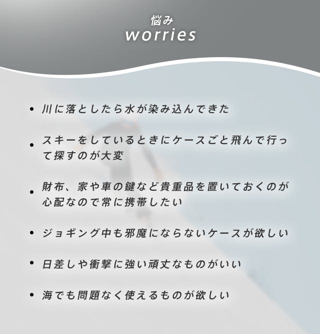 - スキーや釣りなどのアクティビティでは貴重品が濡れないことはもちろん、衝撃にも強くなければいけません。