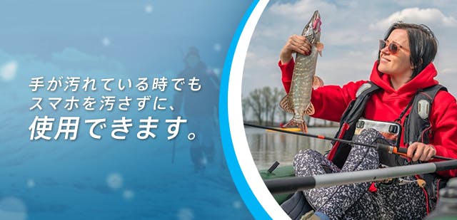 ケースに入れたままの写真撮影ができるので、キャンプや釣りで手が汚れている時でもスマホを汚さずに使用できます。